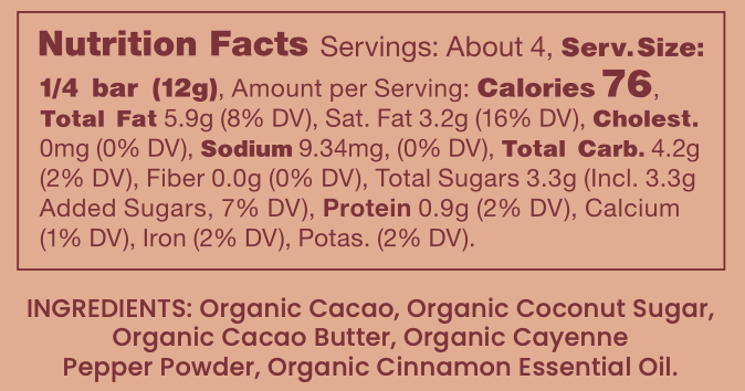 Organic Cacao, Organic Coconut Sugar, Organic Cacao Butter, Organic Cayenne Pepper Powder, Organic Cinnamon Essential Oil