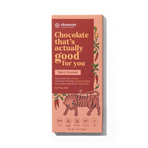 Of course, like everything else from Elements, Spicy Cayenne bar is free from dairy, refined sugar, soy, lecithin, sugar alcohols, natural flavors, gluten or absolutely anything artificial. Think of it as a treat made from two core ingredients: Organic Cacao and Organic Coconut Sugar - the only sweetener! Cinnamon and Pure Essential Oils are added for functional benefits and multi layered taste that lingers on. You have to try this one to experience the magic!