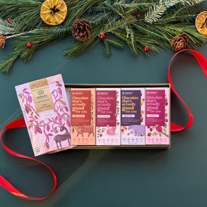 While all our products are free from dairy, we use honey as a sweetener in our chocolate bars. We call them ‘bee’gan! Our Drinking Chocolate Mix, Coco Fuel (Maple glazed cacao nibs), Ayurveda Shakti Bars and Chai-Spiced Protein Powder are all vegan.