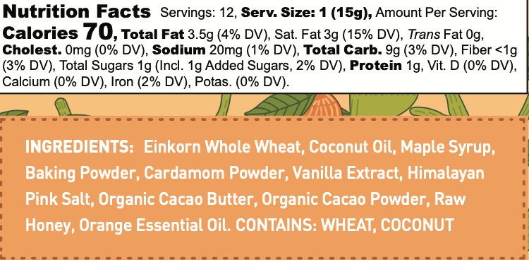 Einkorn Whole Wheat, Coconut Oil, Maple Syrup, Baking Powder, Cardamom Powder, Vanilla Extract, Himalayan Pink Salt, Organic Cacao Butter, Organic Cacao Powder, Raw Honey, Orange Essential Oil. Contains: Wheat, Coconut