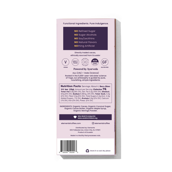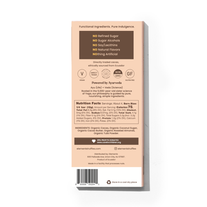 Ingredients: Organic Cacao, Organic Coconut Sugar, Organic Cacao Butter, Blend of Pure Essential Oils, Functional Superfoods