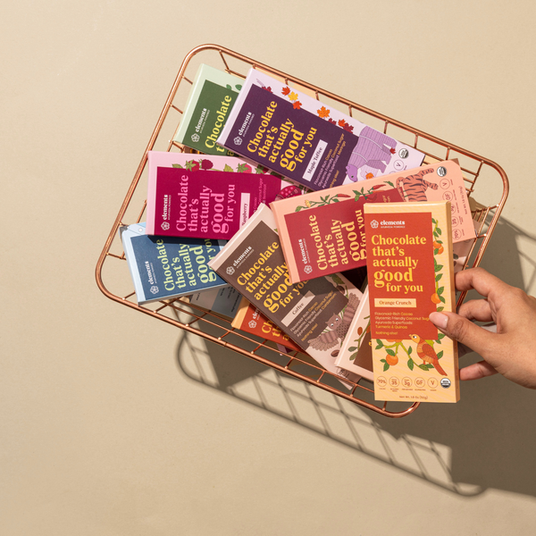 Each bar is hand-crafted, with a beautiful lotus motif. This is our 75% dark collection made with fair-trade Ecuadorian cacao. Sweetened with just honey and infused with ancient Ayurveda superfoods.